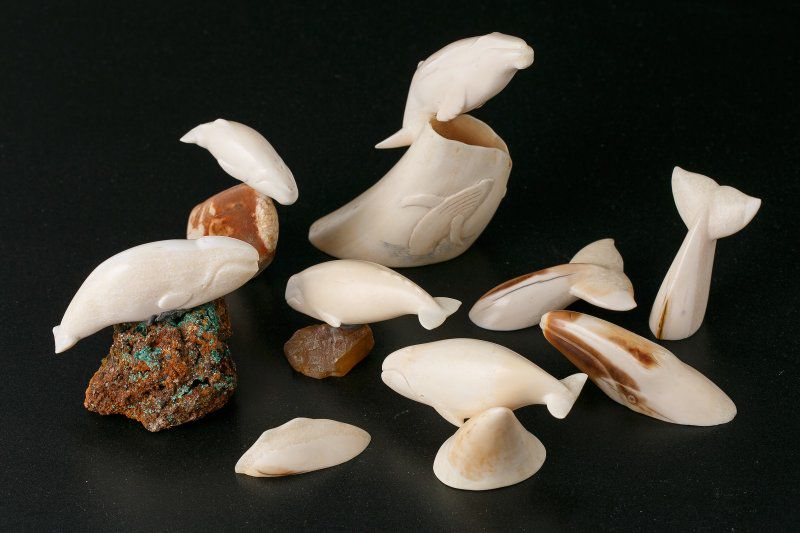 В экспозиции — экспедиционные зарисовки моржей, суровые пейзажи мыса Дежнёва, сцены жизни посёлков Инчоун и Певек. Рядом — скульптуры из дерева и кости: моржи и киты, вырезанные в духе чукотских мастеров‑косторезов. В этих вещах особенно интересно сочетание художественной выразительности и точного знания анатомии и повадок.